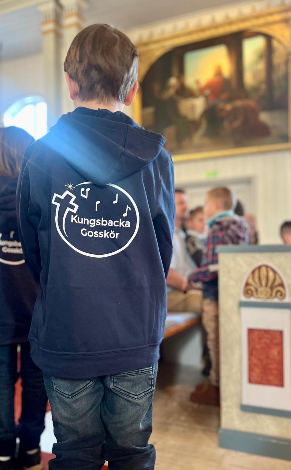 Kungsbacka gosskör består av 10 sångare som vi delar in i en yngre och en äldre grupp . Gosskören startade våren 2018 och vi som leder kören är kyrkomusiker Ulrika Hjertén Åberg och Lisa Fröberg . Vi övar på tisdagar i Kungsbacka kyrka och sjunger på gudstjänster , konserter och luciatåg . En rolig konsert är Fantasy konsert som blivit en tradition i maj månad . Vi har nu börjat använda våra nya körtröjor som bilden visar . Gosskörsfestivalen i södra delen av Sverige har betytt mycket för oss i inspiration .